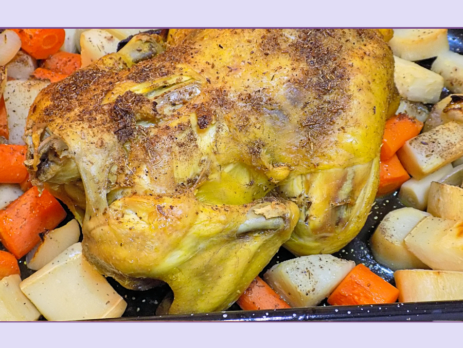 - Place the seasoned chicken and the soup vegetables in an ovenproof tray.