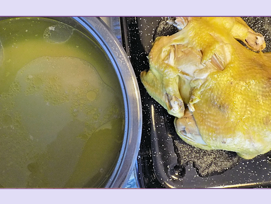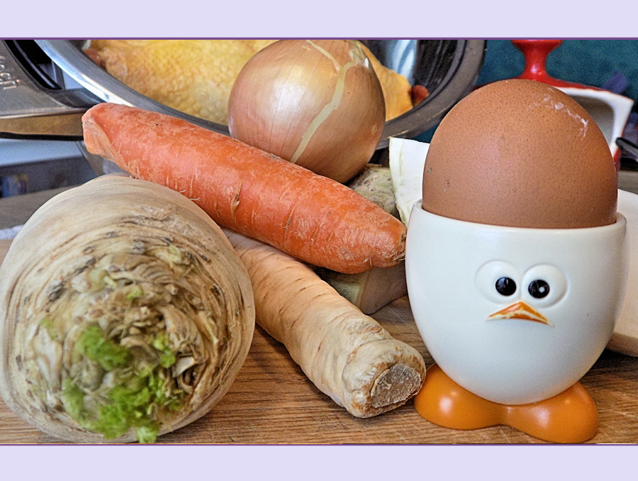 For chicken broth: 1 whole chicken, 2 medium parsnips, 4 average-size carrots, 1 large white onion, ½ medium-size celery root, ½ bunch of fresh parsley, salt and paper to taste.
