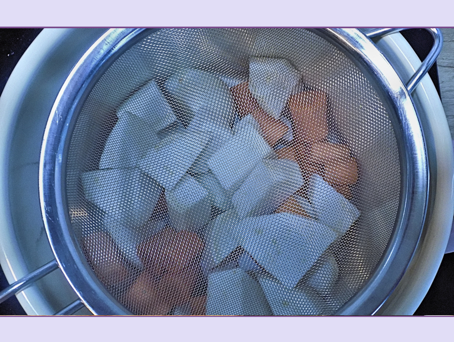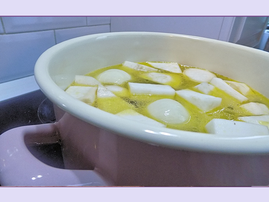 - While the chicken is simmering, cut all vegetables into large chunks.