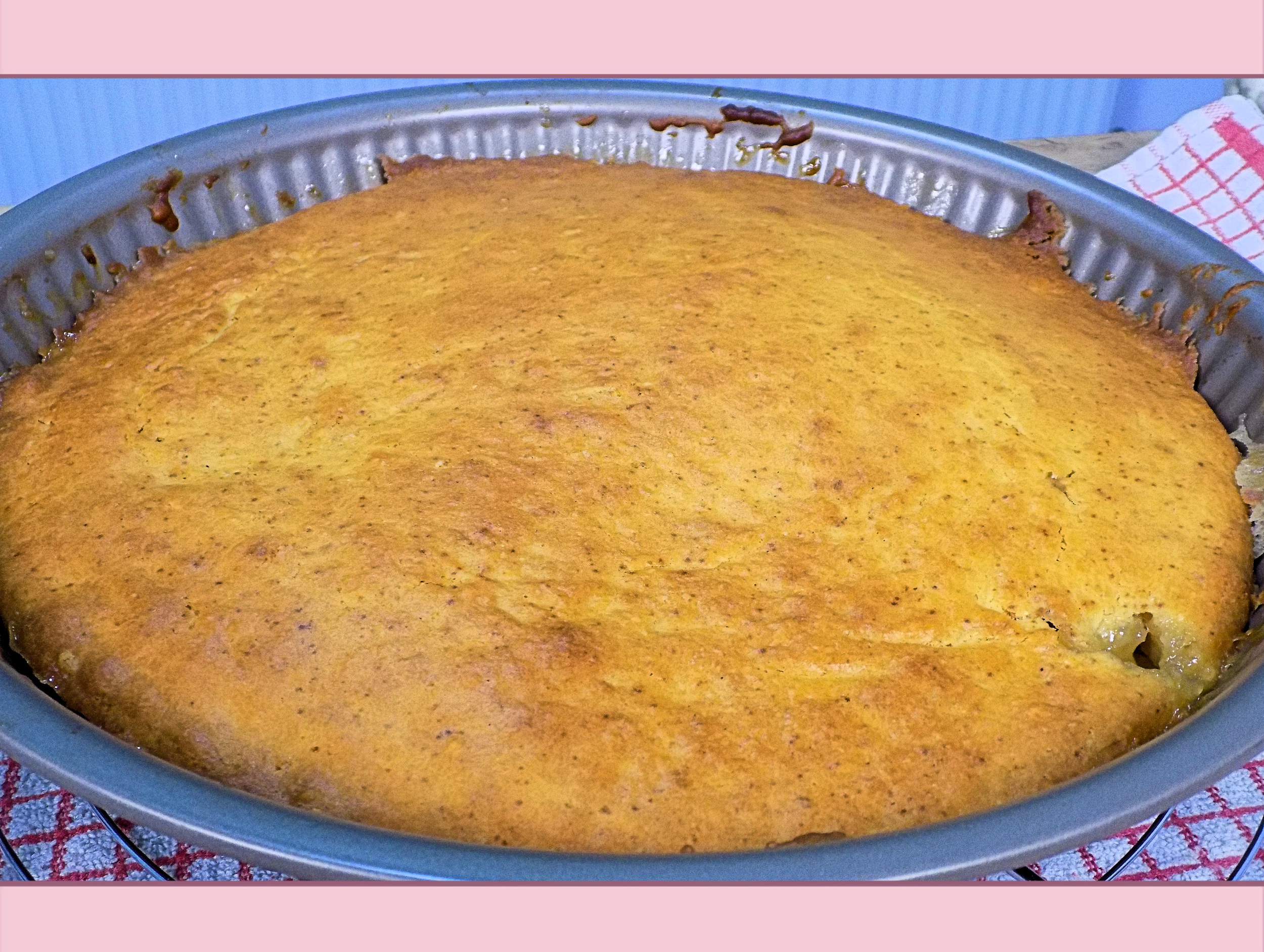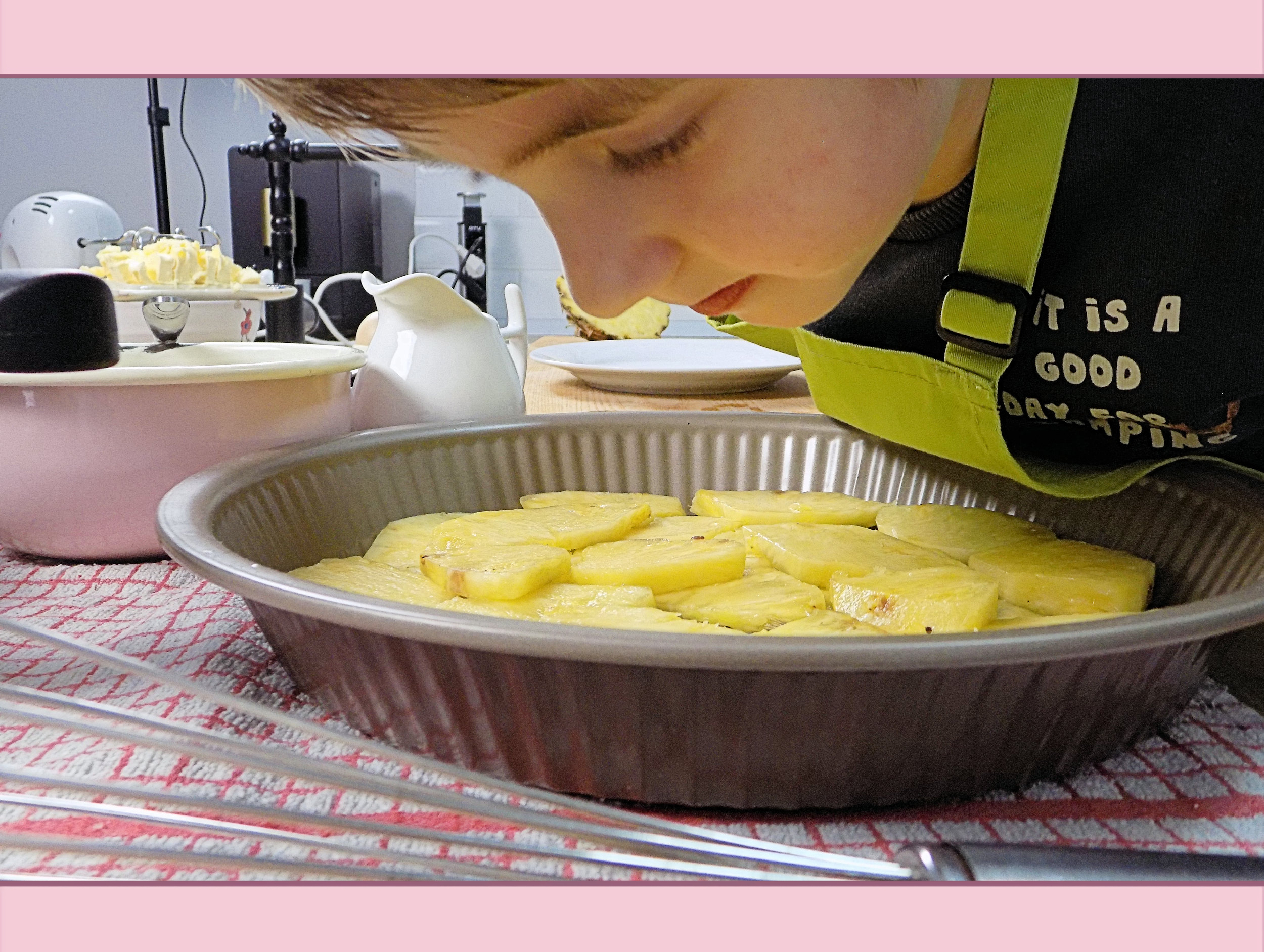 • Pour the batter over the pineapple slices in the cake pan, spreading it evenly.