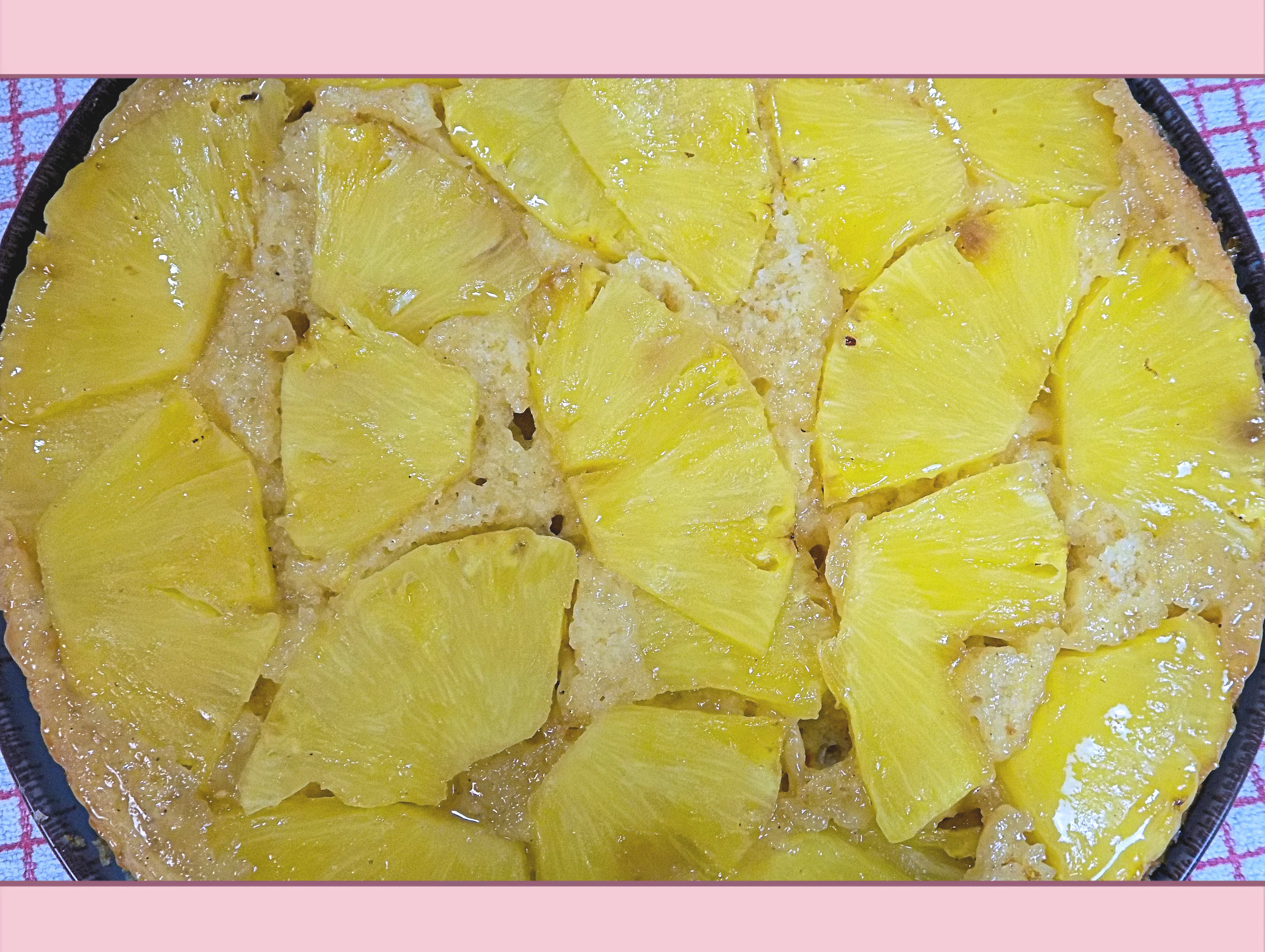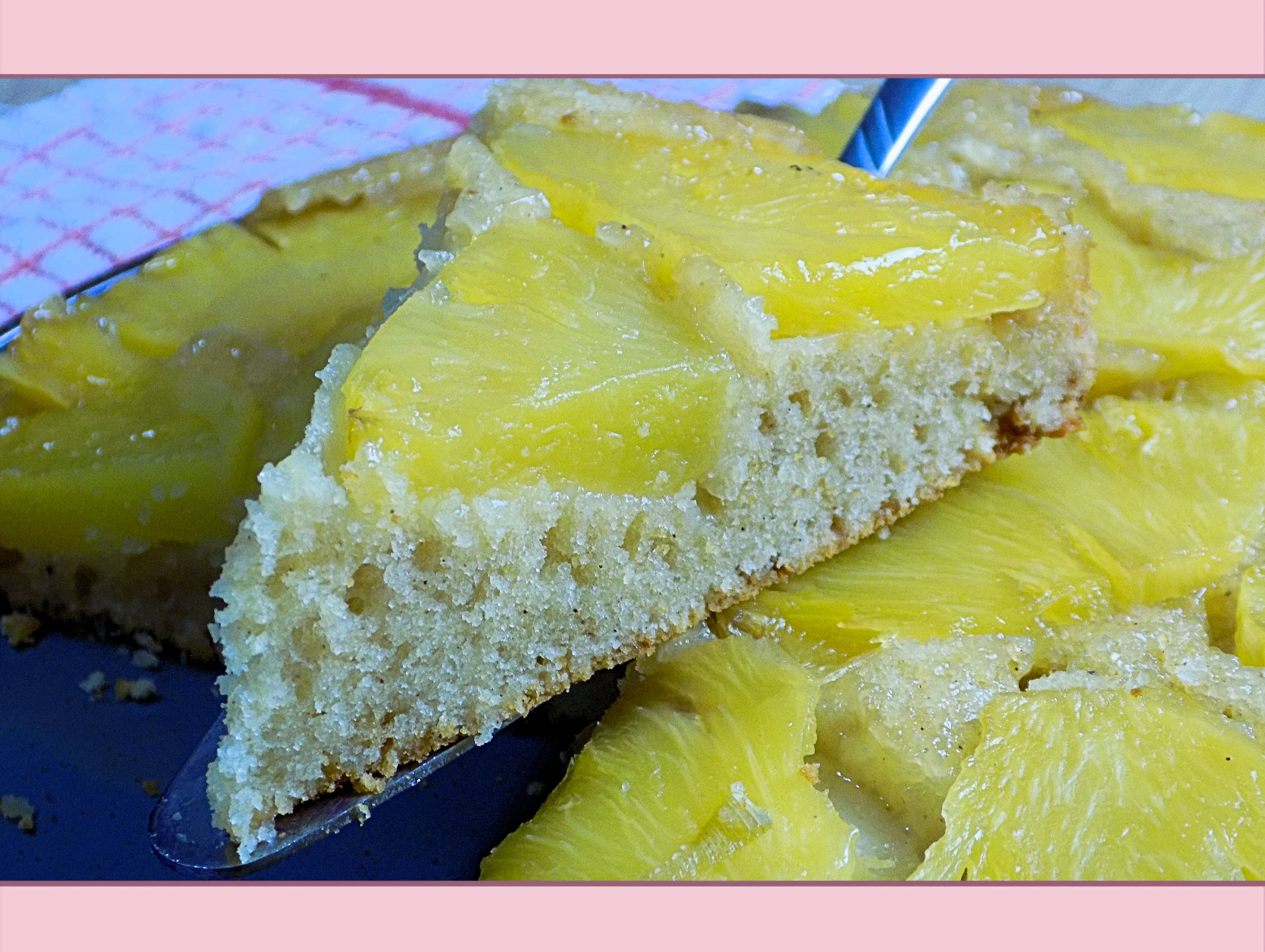 This cake features sweet, caramelized pineapple slices atop a moist, buttery sponge.