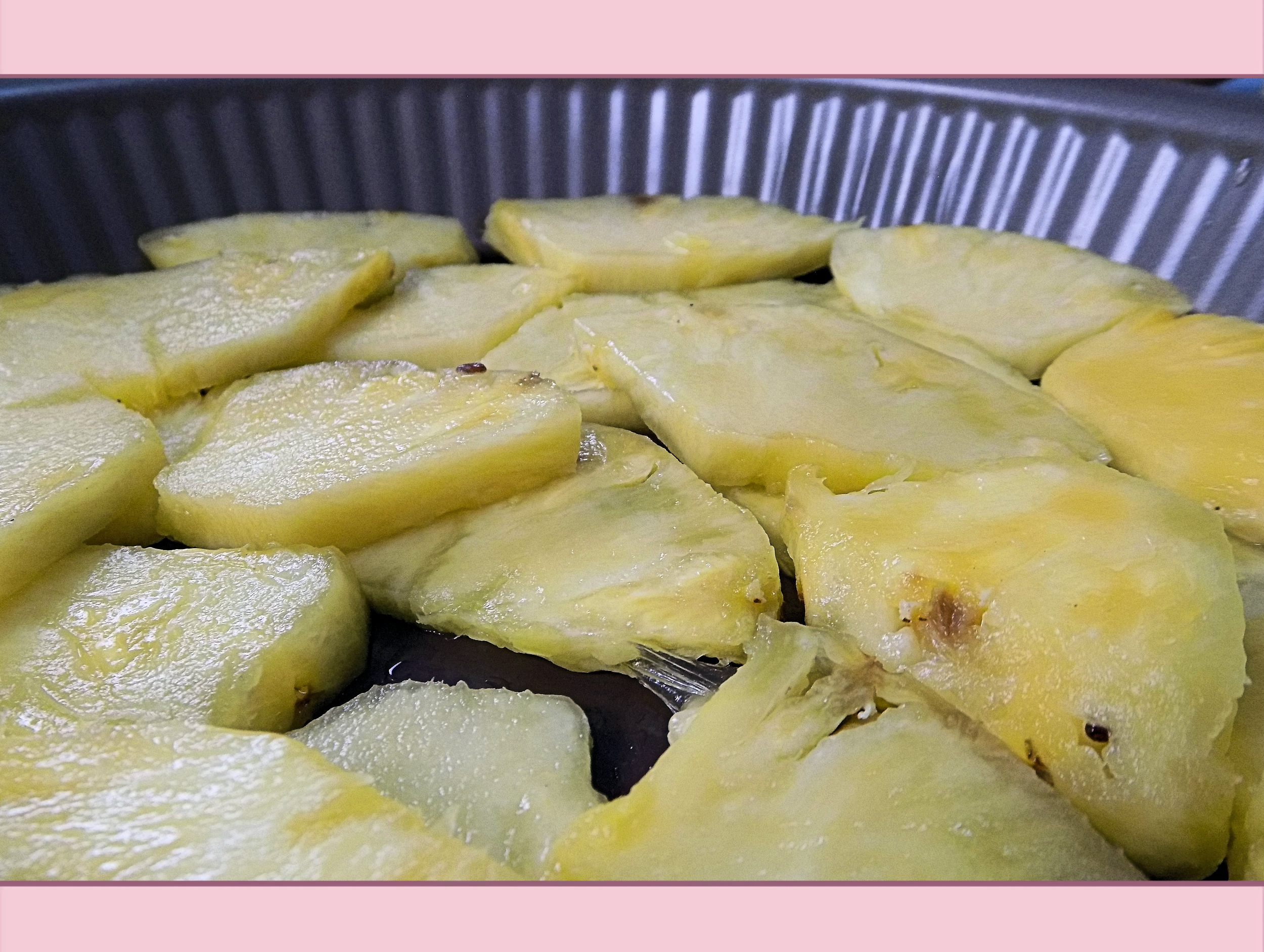 • In a small saucepan over low-medium heat, melt the butter. Add the brown sugar and stir until combined, about 2-3 minutes. Pour this mixture into the greased cake pan, spreading it evenly. Arrange 7-8 pineapple slices in the pan and set aside.